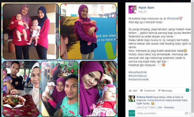 Entah macam mana tengah scroll scroll timeline kat Facebook kan, terperasan lah pulak page Feedmilk. Feedmilk #selamberselak ni kan , menyediakan koleksi pakaian menyusu yang trendy, loose , sopan dan sesuai digayakan pada semua acara. Nak santai-santai boleh, riadah boleh, ke majlis formal pon boleh. Selain blouse, terdapat juga koleksi jubah . Yang uniknya, koleksi Feedmilk #selamberselak tiada butang dan zip sangat berbeza dengan pakaian muslimah & nursing wear yang lain, namun masih mengekalkan ciri-ciri breastfeed & wudhu' friendly. Yang best nya juga, jimat masa dan bebas. Tak payah dah nak bawak kehulu hilir nursing cover. Kadang semua tempat kita pergi , belum tentu ada nursing room. Dengan Feedmilk #selamberselak memang jimat masa, dah la ironless.